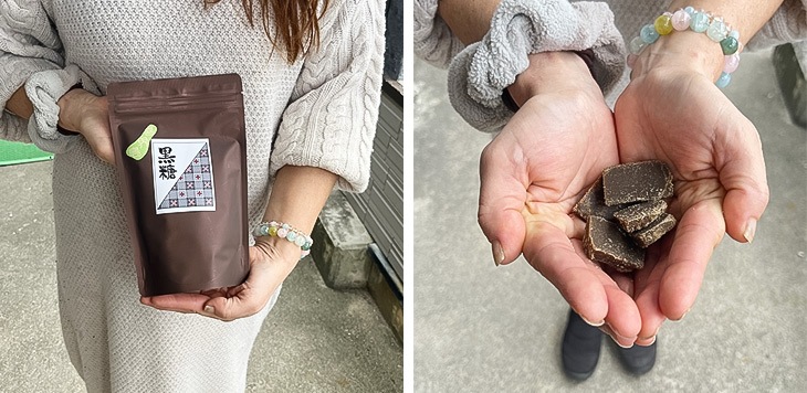 適度な大きさにカットされた黒糖をひと噛みすると、純黒糖ならではのコク深い味わいがお口に広がります。